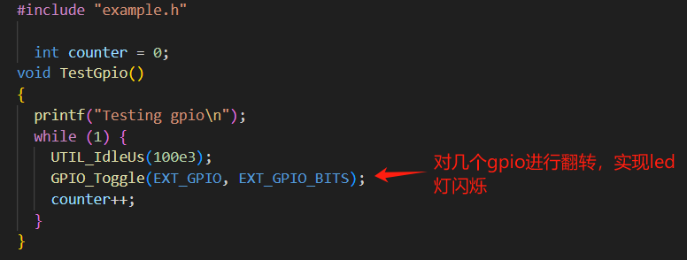 注意的是,这里使用的EXT_GPIO, EXT_GPIO_BITS,就是board_init()里初始化过的ext的gpio。GPIO_Toggle函数是对gpio进行翻转,也没什么难理解的。